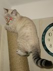 to best17: Сонька - кошка отличная. Дружелюбная, игривая, в меру независимая. Когда прихожу вечером с работы - делает от радости два-три круга с "препятствиями" и гиканьем в бешенном темпе по всей квартире - и в туалет со мной. Как и все кошки - все понимает. Но делает то, что от нее хотят, только тогда, когда ей самой этого хочется. Практически никогда не шкодничает. Вся мебель целая. Правда, я ей организовал два столбика, обвитых канатом, для игр и подточки когтей. Невысокий маленький - ее любимая игрушка. Когда приезжаем с дачи - с ходу к нему. Хоть на даче и налазится по деревьям так, что потом пару дней дрыхнет. Не брезгует и высоким (см фото)! Да, с Зоей договорились! Правда, Тимофей еще не в курсе