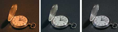 Для подтверждения вышесказанного можно привести конкретный пример. Снимок на рис. 6 был сделан при свете лампы накаливания, но по ошибке в настройках камеры была выбрана неверная установка баланса белого (соответствующая дневному свету). При съемке в JPEG получился результат, показанный слева: как и следовало ожидать, на нем наблюдается явный избыток красного и оранжевого. Обработав исходный JPEG в Photoshop (была задействована функция Match Color, а также выполнена ручная регулировка цветового баланса и тональных кривых), удалось достичь некоторых улучшений (результат — в центре). Однако из-за потери полезной информации в процессе этих преобразований появились заметная ступенчатость и синеватый ореол на границах теней.