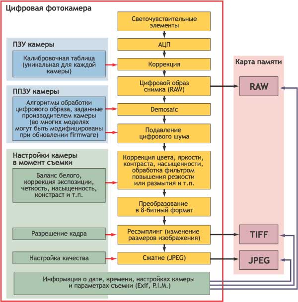 Прежде всего откажемся от распространенных у начинающих пользователей цифровых фотокамер стереотипов (вроде «TIFF — это хорошо, а JPEG — плохо», «между RAW и TIFF нет принципиальных различий» и т.п.) и начнем изучение данного вопроса с рассмотрения процессов, происходящих внутри цифровой камеры во время съемки и записи изображения. При этом не будем углубляться в технические тонкости процессов, происходящих внутри цифровых камер (тем более что у аппаратов разных производителей они могут в значительной степени различаться), а ограничимся лишь блок-схемой технологической цепочки, на входе которой имеется изображение, проецируемое объективом камеры, а на выходе — готовый файл.