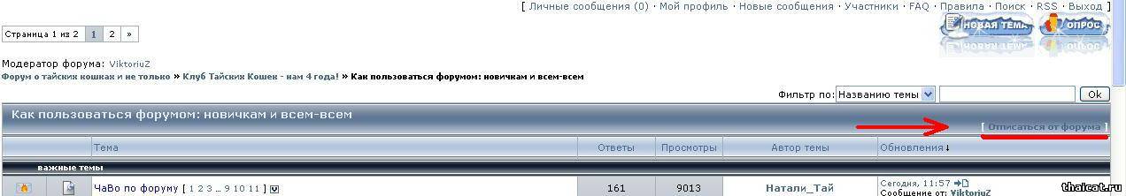 Цитата (4 пункт) 4. Усовершенствованная подписка на темы и форумы Раньше, для подписки на тему по e-mail обязательным условием была публикация сообщения в теме. Сейчас подписаться на любую тему (а также целый форум!) можно нажатием одной кнопки "Подписаться". Управлять своими подписками можно на странице "Подписки" (ссылка на страницу: http://www.thaicat.ru/forum/0-0-1-46)