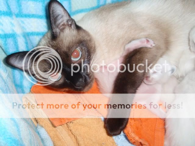 Здравствуйте уважаемые форумчани! Госпожа Алиссия и ее мама Славина, решили представиться. С опозданием, но все же. Совсем недавно, мы все дружно рожали в он-лайн. У моей девочки родилось 5 ангелочков, 3 девочки и 2 мальчика. Но начну-ка я сначала. 13. мая 2008 года в моем доме появилось догожданное дитя, маленький тайский хвост. Спустя всего пару дней, мы стали с девулей неразлей вода и подобрали ей имя: Алиссия. С тех пор прошло чуть больше года. Я очень рада, что приняла решение взять тайского котенка! 26. мая, моя сладкая девочка родила. Всем тем, кто в трудные минуты родов поддерживал нас советами, большое спасибо. Сейчас нашим малышем почти 2 недели, они пыхтят, спят, едят и деруться )))) Я очень ответственно отношусь к выбору их родителей и очень надеюсь, что будущие мамы и папы, станут любить своих крошек, как и я. а вот и фото: