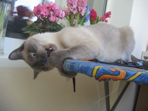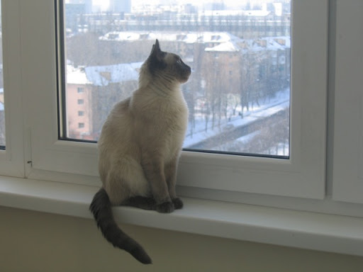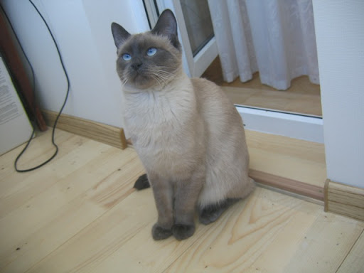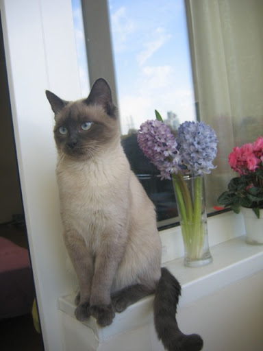 Януш уже вырос, стал кабанчик на 3 с лишним кило. Нижние клыки уже поменялись на взрослые, а верхние похоже только растут, причем рядом с молочными, которые еще не отпали. Вид довольно устрашающий: мордашка еще юниорская, а клычищи нижние полноразмерные как у вампира :). Интересно, все тайцы так любят с человеком играться, чтобы мышку бросать-приносить или фантик на веревочке ловить? Если вздумает поиграться, так покоя не даст, будет прыгать на стол, мурчать и целоваться, пока не поиграешь :). Иногда садится возле входной двери и мяукает от избытка чувств, а если откроешь дверь так сразу пулей вылетает в коридор и с разбегу в пыль бросается и катается в ней на спине, как свинюка :). Но если кто-то из соседей, не дай бог, будет проходить, тогда пулей домой, с ирокезом на спине и напружиненным хвостом - чужих боится. А вот и фото
