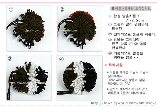 Да, и расскажу заодно как кручу помпоны. Тоже нашла в интернете. Немного прокомментирую. На начальном этапе нитку не привязываю, и так нормально держится. В конце вместо иглы использую крючок, при помощи которого продеваю нитку в дырочку.
