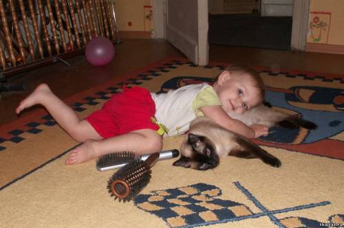 Какой терпеливый зверёк.Дети иногда их так мучают. :o.ваша я вижу,лояльно относится к ребёнку.Нянчит.