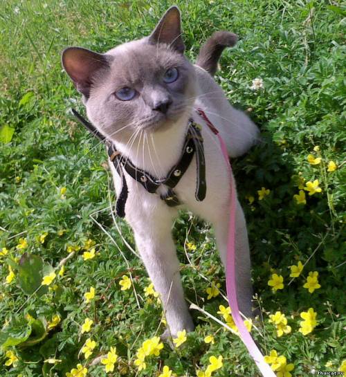 Сайчас правда повзрослел и понимает режим нашей жизни.Очень любит гулять.Я заметила что тайские коты и кошечки хорошо гуляют на шлейке.Это их особенность.Ириса я приучала с самого раннего детства. smile