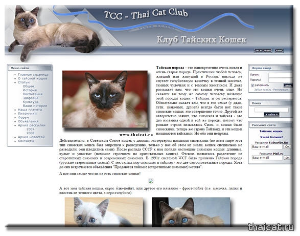 В 2007 году я уволилась с работы, и не хотела выходить на работу с 8 до 5. И начала думать о том, чем же мне заняться. Сложные поиски тайского котенка, и вообще вся эта неразбериха с сиамо-тайцами подтолкнули меня к созданию сайта Клуб Тайских Кошек. Мне хотелось создать удобный ресурс, где можно было бы купить тайского котенка, узнать о том, как его содержать. Мне хотелось создать такое место, где котородителям помогают, где их поддерживают. Именно Дафна меня вдохновила на этот сайт. И именно Дафна была на шапке сайта.