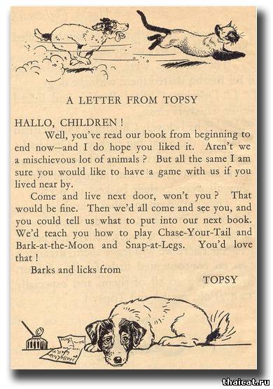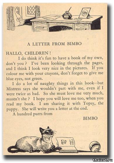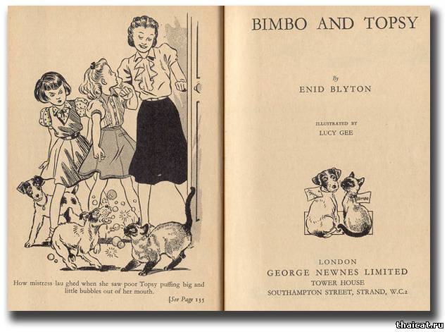 Как неожиданно оказалось у этой замечательной и одной из моих любимых, кстати, писательниц дома жили сиамская кошечка по кличке Бимбо и фокстерьер Топси. Ну, а раз она писательница, то, конечно же, она написала книгу про Бимбо и Топси. Первое издание этой книги состоялось в 1943 году.