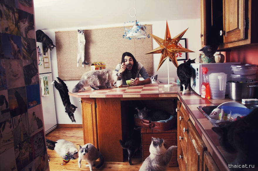 Хотя, конечно, никто из героев фотографий не владеет котофермой, все снимки были сделаны с помощью совмещения кадров, благодаря чему один и тот же кот (или два) "размножился" по всей комнате. Впрочем, снимки ушли недалеко от реальности: владельцы кошек знают, что их любимцы имеют свойство находиться одновременно в разных местах и шкодить с поразительной скоростью. На то они и кошки.