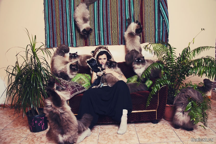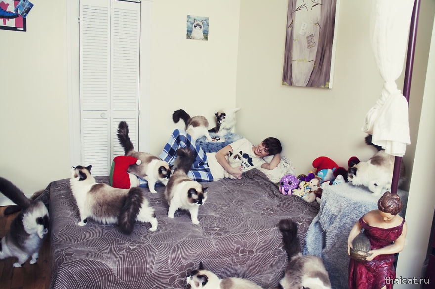 Канадская 23х-летняя девушка фотограф Андриан Лупьен (Andréanne Lupien) создала фотопроект, который тут же облетел весь Интернет. Называется он - "Crazy Cat Lovers”, что можно перевести как "Сумасшедшие любители кошек". На этих фотографиях счастливые владельцы пушистых любимцев окружены буквально сонмом прыгающих, спящих, бегающих и даже летающих кошек и котов.