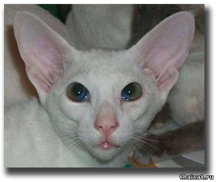Например, мозаика пигмента радужки глаз проявляется в том, что отдельные участки глаза окрашены, например, в желтый цвет, а другие - в голубой. Иногда это действительно выглядит как мозаика - участки разных цветов имеют причудливую форму. Иногда глаз может быть разделен ровно пополам, как у ориентальной кошки на фото ниже.