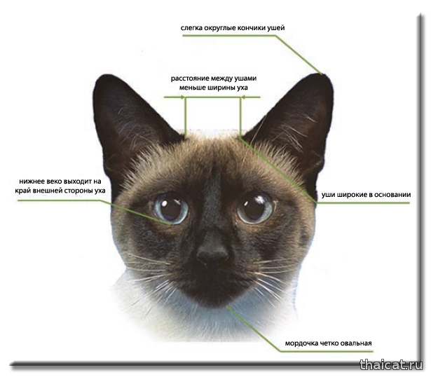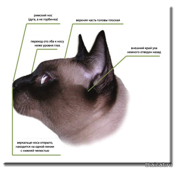С мягко округлыми контурами. Верхняя часть головы почти плоская. Профиль с переходом ниже уровня глаз. Римский нос. Сильный подбородок и нижняя челюсть, четко овальная мордочка с переходом в области вибрисс.