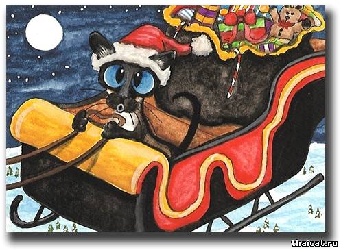 После того, как елка наряжена, наступает самое ответственное дело! Приготовить подарки! Тут уж не обойтись без Санта-Клауса! Но Санта-Клаусу сегодня уже некогда ездить по домам сиамских котиков, сиамские котики - они ведь сами с усами! Поэтому Санта-Клаус разрешил Сиамскому Котику самому воспользоваться рождественнской каретой и доставить подарки домой. Вот как!