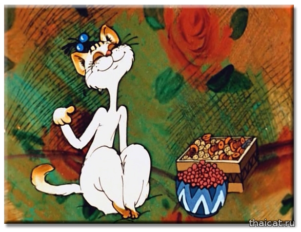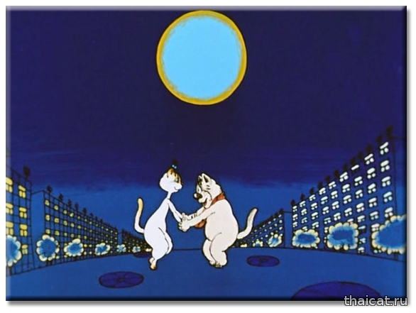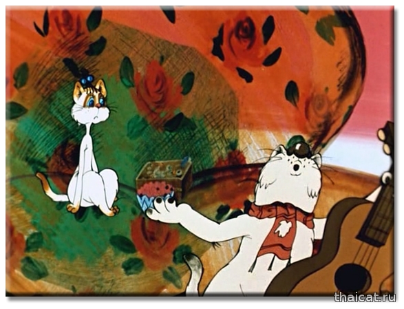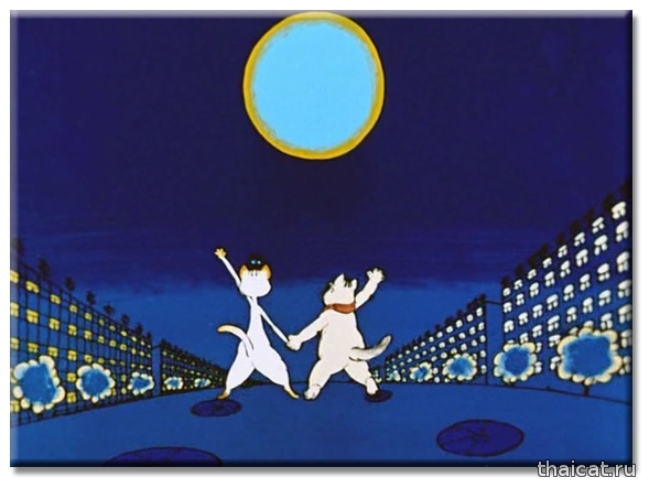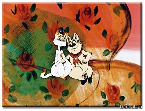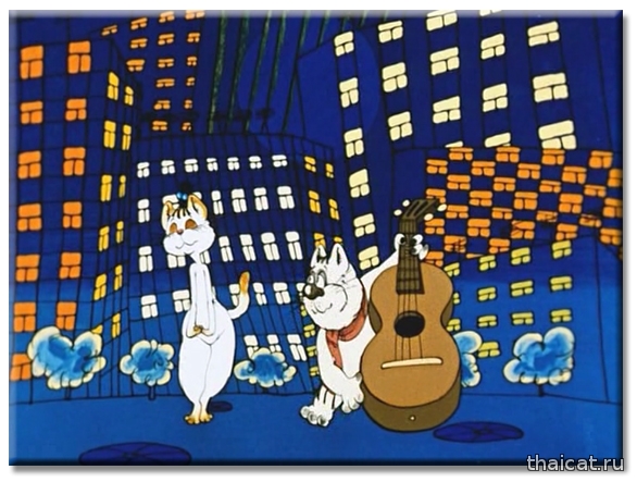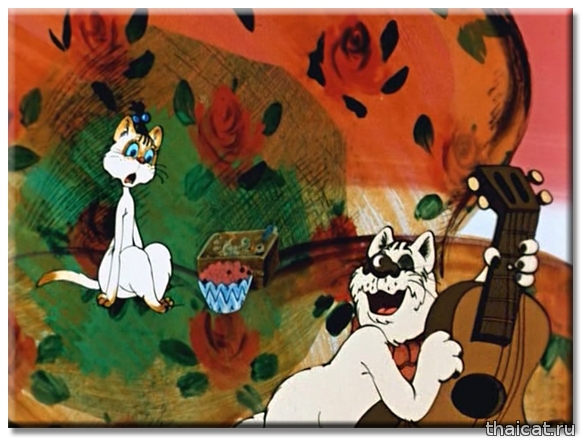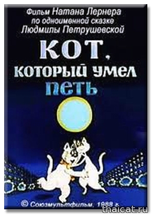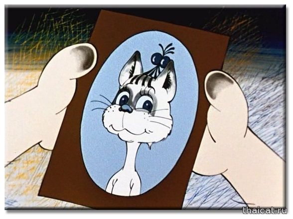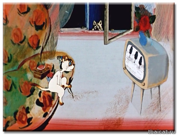 Помните ли вы такой мультик «Кот, который умел петь?». Сюжет больше для взрослых, нежели для детей. Влюбленный и бездомный котяра пытается обратить на себя внимание прекрасной соседки, которую за уши не оттащишь от телевизора и плюшек. 1988 год. И та прекрасная киска-соседка – чудесная и милая сиамочка! У нее, как и положено, голубые глаза, темные носочки, хвостик, ушки и масочка. Режиссер-мультипликатор этого фильма Натан Оазисович Лернер (1932-1993). (Интересно, были ли у него сиамские кошки?)
