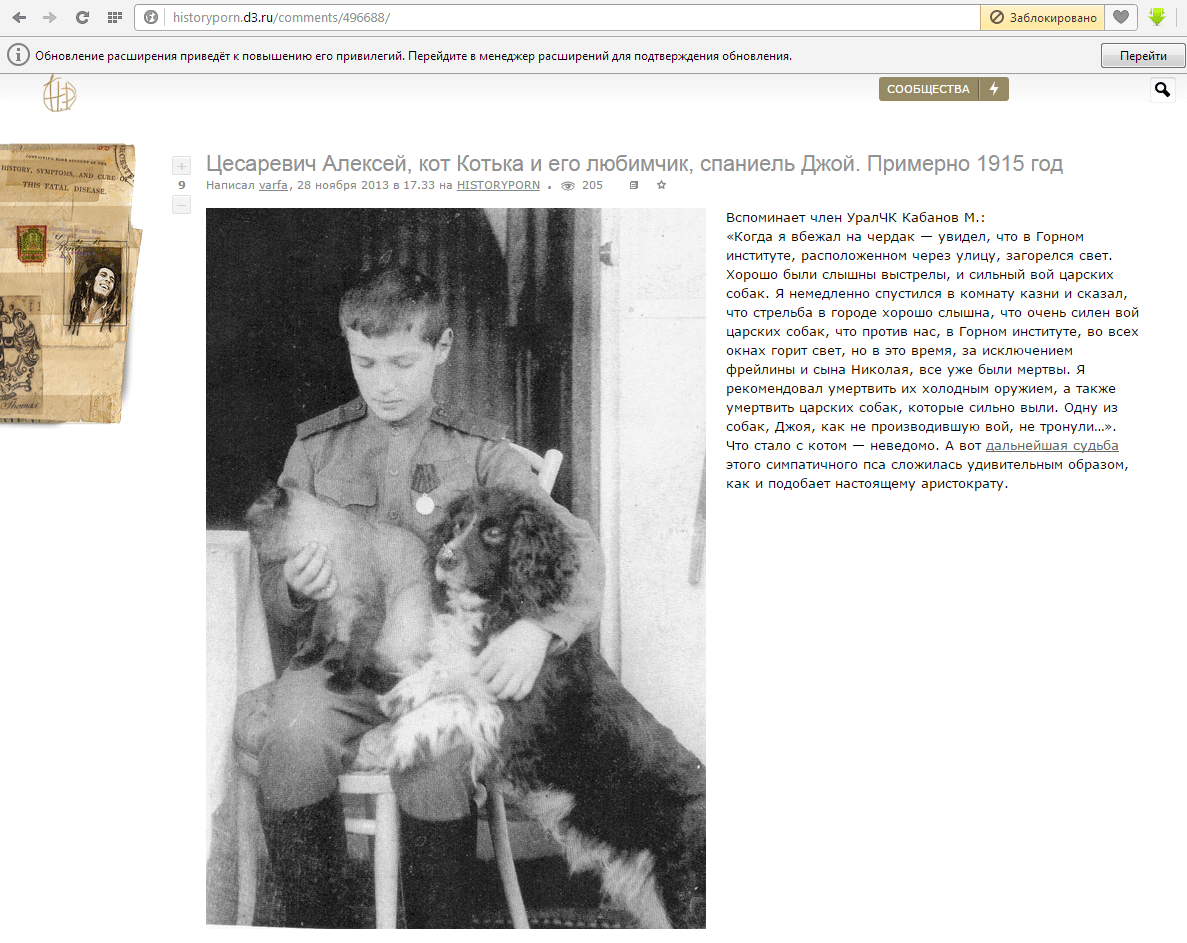Уезжая из Царского Села в ссылку (как они тогда думали) в Тобольск, собак дети взяли с собой. К сожалению и большому огорчению наследника, Котьку, как и других кошек, пришлось оставить.