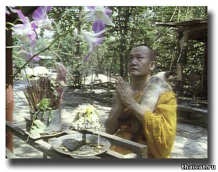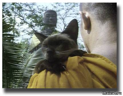 Тайские храмы служат приютом для кошек всех видов и пород. Буддистского монаха окружает неслыханное генетическое богатство. Весь широчайший спектр юго-восточных пород кошек. С его руки одновременно кормятся черепаховая сиамка и рыжая кошка. Обе они результат смешения местных таиландских пород с прибывшими позднее рыжими кошками. Специфическая окраска черепаховой сиамки – это смесь черного и рыжего цветов, что наиболее ярко заметно у этого тоже черепахового сиамского котенка.
