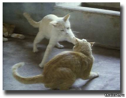 А у этого забияки голубые глаза. Значит, несмотря на слишком светлую окраску, он тоже сиамской породы. (Речь идет о кошке окраса крем-пойнт. Прим. Н.Т.).