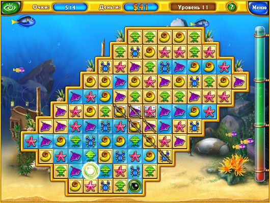 ОПИСАНИЕ ИГРЫ: Интересная головоломка в стиле "три в ряд", в которой вы создадите свой собственный виртуальный аквариум с экзотическими рыбками. Не забудьте создать для них подходящие условия: установите компрессор, кормушку, разложите на дне красивые ракушки и посадите водоросли. Все это потребует денег - чтобы заработать их, собирайте на игровом поле золотые плитки, складывая над ними непрерывные цепочки из одинаковых фишек.